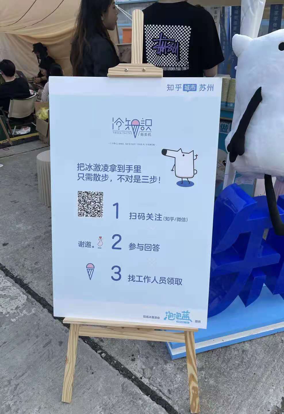 活動現場泡泡藍共設置了三個打卡區域。分別是:掃碼進入知乎平臺,參與回答領取冰淇淋、咖啡嘉賓毛作東老師現場解答關于咖啡有關問題、掃碼進入知乎觀看和參與討論咖啡冷知識。